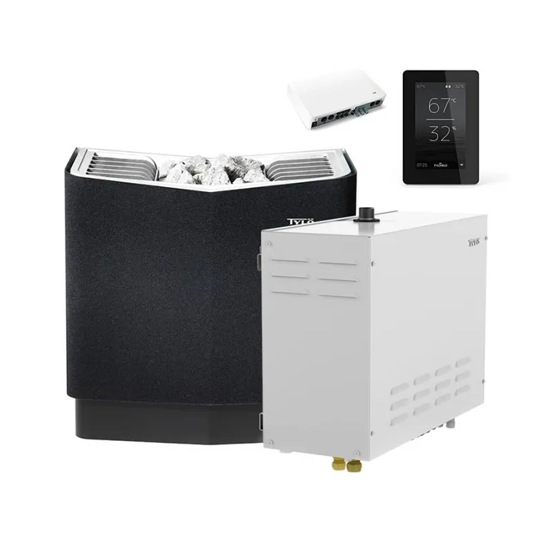 木製のサウナルームにドライサウナ機器とスチーム発生器を設置し、温度と湿度をコントロールしつつサウナルームを温める装置になります。 浴室外に設置したリモコンで温度と湿度を自由に設定することができ、体感温度高めな強気なサウナ室にも、マイルドなサウナ室にもなる新感覚サウナです。ドライサウナとスチームサウナの両方を扱うティーロ社にしか作れない新しいサウナをぜひ体感してみてください。